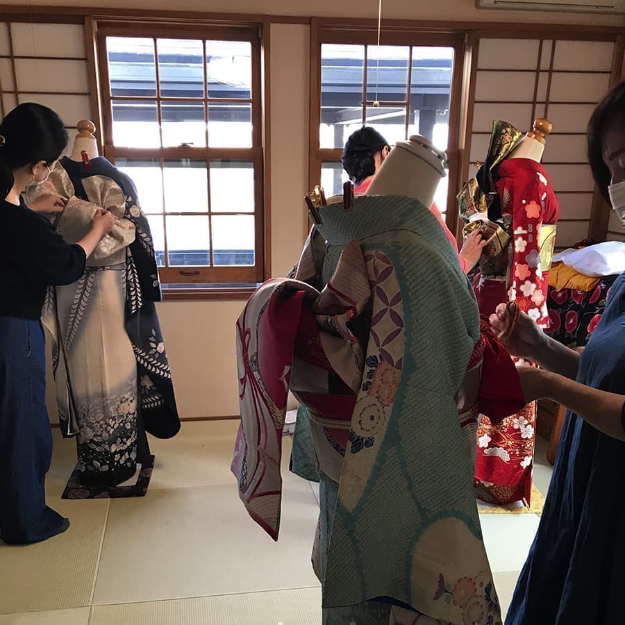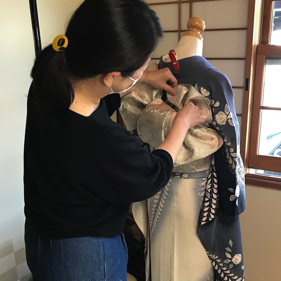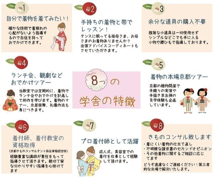 当教室では複雑な小道具は一切使用せずシンプルなどこでも手に入る小物や腰ひもで指導しておりますので安心して通っていただけます。また着物に関する困りごとやご相談等ございましたら、どうぞ遠慮なくご連絡下さい。第三者的な立場で解決いたします。